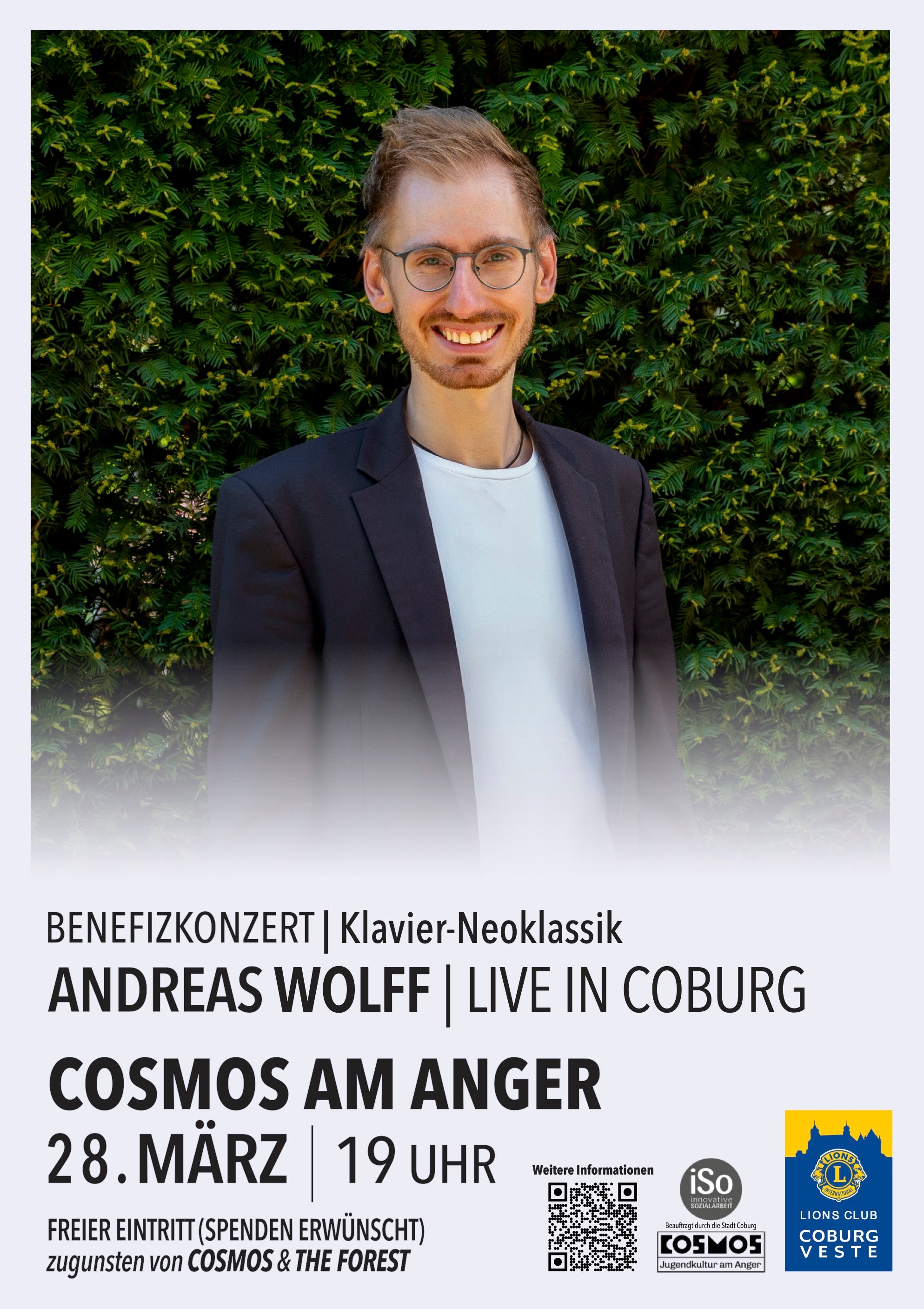 Das Benefizkonzert findet am 28. März um 19 Uhr im COSMOS am Anger statt und unterstützt gleich zwei Herzensprojekte des Komponisten: das Jugendkulturzentrum COSMOS am Anger sowie das Aufforstungsprojekt THE FOREST von Martin Kohlstedt.