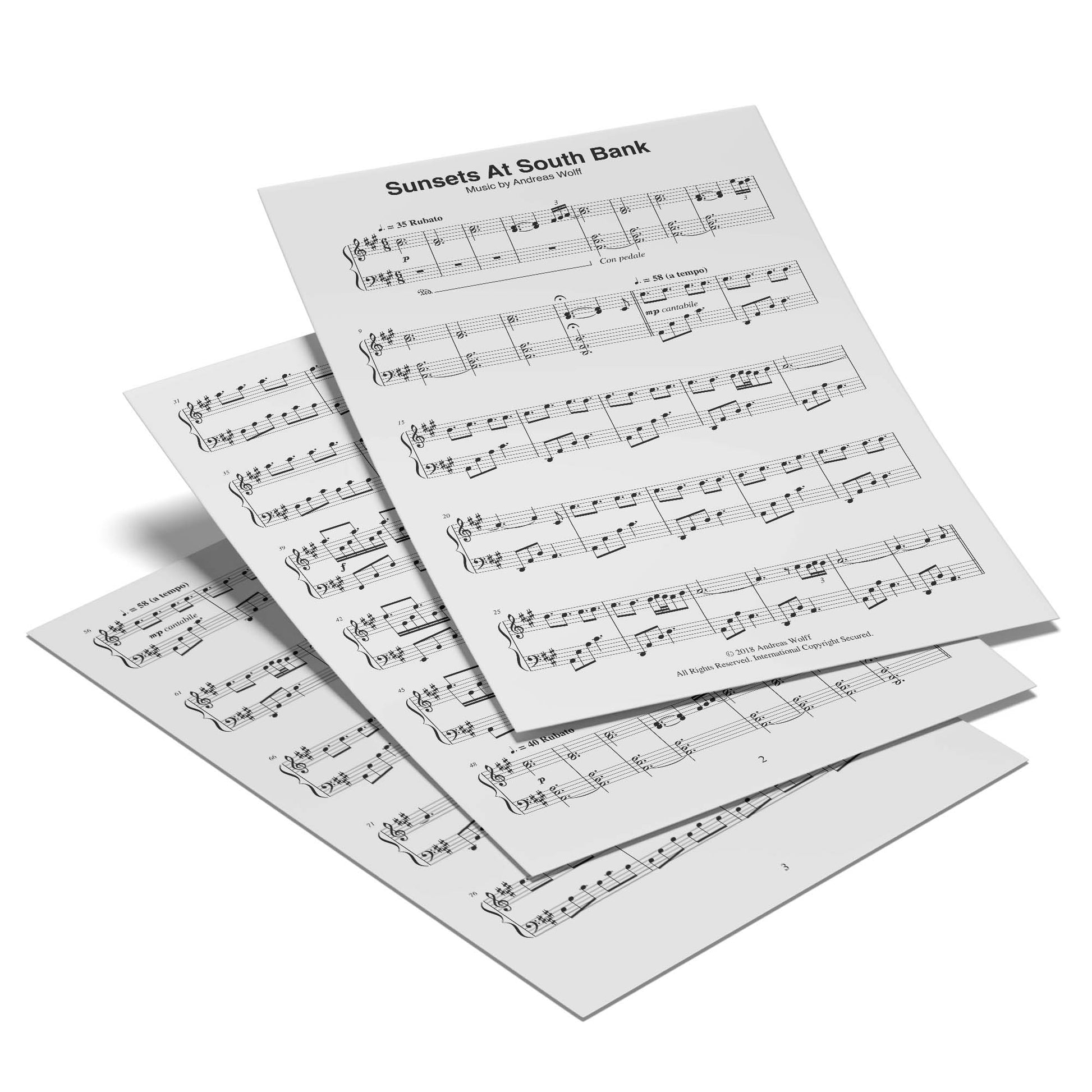 The piano sheet music of 'Sunsets At South Bank', from Andreas Wolff's second EP 'Wayfaring'.